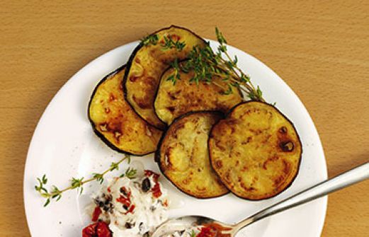 Auberginen-Chips mit Ziegenfrischkäse Zutaten 1 längliche Aubergine (ca. 250 g) Salz 200 g Ziegenfrischkäse 100 g Joghurt 2 Zweige frischer Thymian 2 getrocknete Tomaten (in Öl) 4-5 schwarze Oliven (ohne Stein) Pfeffer ca. 3 EL Mehl Olivenöl zum Braten 6 TL Honig guk:s [...]