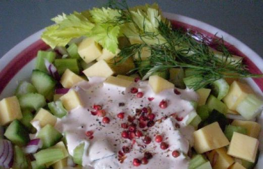 Käse-Salat Zutaten 200 g Staudensellerie - vorbereitet gewogen 200 g Salatgurke - vorbereitet gewogen 1/2 rote Zwiebel 200 g Käse - Gouda oder Edamer 200 g Schmand ca. 100 ml Buttermilch 2-3 EL Ketchup 2 Knoblauchzehen Salz bunter Pfeffer frischer Dill guk:similarity-keyword [...]