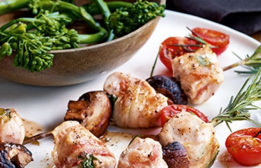 Rosmarinspieße mit Lardo-Hähnchen-Würfeln Zutaten 350 g Hähnchenbrustfilet frisch gemahlener weißer Pfeffer 1/2 Bund Petersilie 100 g Lardo in hauchdünnen Scheiben 150 g sehr kleine, feste braune Champignons 8 lange, stabile Zweige Rosmarin 4 EL Olivenöl Salz 150 g Kirschtoma [...]