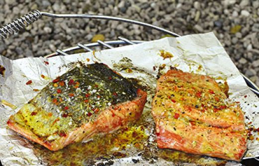Fenchel-Lachs mit Senf Zutaten 1 getrocknete Chilischote 2 TL grobes Meersalz 4 TL Fenchelsamen 4 EL Dijon-Senf mit Honig 6 EL Walnuss- oder MAndelöl (ersatzweise Olivenöl) 4 Lachsfilet (je etwa 250 g, mit Haut, möglichst aus dem Mittelstück) Alufolie und Öl zum Grillen guk:sim [...]