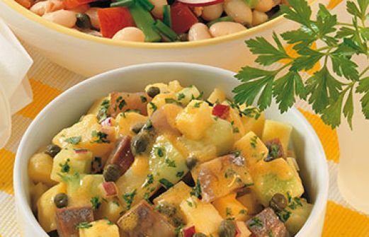 Matjessalat mit Apfel, Gurke und Kartoffeln Zutaten 2 vorwiegend fest kochende Kartoffeln (etwa 250 g) 1 kleine Salatgurke (etwa 150 g) 2 säuerliche Äpfel 1 milde weiße oder rote Zwiebel 4 doppelte Matjesfilets 1/2 Bund Petersilie 1 TL scharfer Senf 2 1/2 EL Zitronensaft Salz [...]