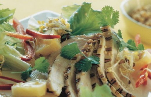 Paprika-Ananas-Salat mit Sprossen und Hähnchen Zutaten 400 g Hähnchenbrustfilet 3 EL Teriyaki-Marinade 3 rote Paprikaschoten 1 frische Ananas (ca. 1,2 kg) 100 g Mungobohnensprossen Pfeffer 6 EL Maiskeimöl Salz 150 g Salatblätter (z. B. Frisée) 1 Bund Koriander 3 EL Sesamsaa [...]