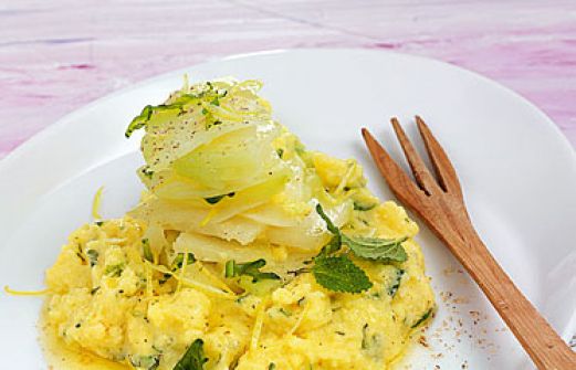Käse-Kräuter-Polenta mit Kohlrabi Zutaten 2 Kohlrabi 1/8 l Gemüsebrühe 1/2 Bund Zitronenmelisse oder Rucola 2 Frühlingszwiebeln 150 g Fontina, nicht zu alter Bergkäse oder Gorgonzola 2 EL Butter 250 g Instant-Polenta 3/4 l Milch 1 Stück Bio-Zitronenschale (etwa 2 cm) Salz [...]