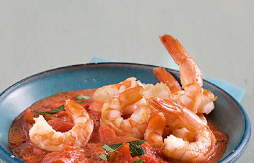 Garnelen mit Tomaten-Paprika-Gemüse Zutaten 1 Knoblauchzehe 200 g eingelegte Paprikaschoten (aus dem Glas) 2 EL Öl 1 Dose stückige Tomaten (400 g Inhalt) 2 TL Instant-Gemüsebrühe 2 EL Tomatenmark 2 EL Sahne Salz Pfeffer 300 g geschälte rohe Garnelen (frisch oder TK) guk: [...]