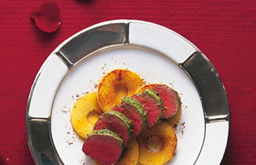 Rehrücken mit Pistazien-Zimt-Kruste Zutaten 60 g Pistazienkerne 1 TL getrockneter grüner Pfeffer Zimtpulver Salz 2 EL zimmerwarme Butter 200 g ausgelöster Rehrücken frisch gemahlener schwarzer Pfeffer 2 EL Butterschmalz 2 kleine säuerliche Äpfel 1 TL Orangenblütenwasser [...]