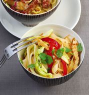Reisnudeln mit Zucchini und Feta Zutaten 100 g Kritharaki (reisförmige Nudeln) Salz 400 g junge Zucchini 1 Knoblauchzehe 2 EL Olivenöl 6 EL Gemüsebrühe 1 EL Zitronensaft 100 g Feta 50 g schwarze Oliven, ohne Stein (Glas) 1/2 Bund Petersilie Pfeffer Pulbiber zum Bestreuen [...]