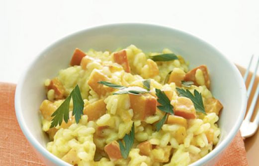 Kürbisrisotto Zutaten 250 g Hokkaido-Kürbis 2 Schalotten 1 Knoblauchzehe 60 g Parmesan am Stück 1 Bio-Zitrone 50 g Sahne 2-3 EL Olivenöl 200 g Risottoreis (z. B. Arborio) 100 ml Weißwein 750 ml Geflügebrühe Salz Cayennepfeffer frisch geriebene Muskatnuss 30 g weiche Bu [...]