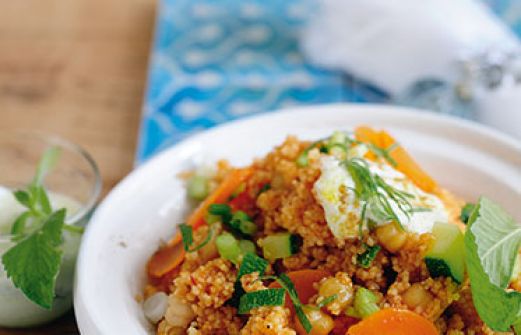 Gemüse-Couscous mit Minzjoghurt Zutaten 2-3 Möhren 2 Zucchini 1 Bund Frühlingszwiebeln 1 kleine Dose Kichererbsen (240 g Abtropfgewicht) 3 EL Olivenöl 1/2 l Instant-Gemüsebrühe je 1 TL gemahlener Kreuzkümmel und Koriander 1/2-1 TL Harissa (Chilipaste) 250 g Instant-Couscous [...]