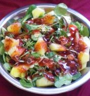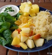 Ananas-Feldsalat mit Ingwerwürfeln Zutaten 1/3 Ananas (ca. 350 g) 1 rote Zwiebel 200 g Feldsalat 4 EL naturtrüber Apfelessig 1 EL Agavendicksaft 4 EL Sojasauce 1 1/2 TL Ingwerpulver 8 EL Öl Salz Pfeffer je 100 g Seitan und Tofu 2 EL frisch gepresster Zitronensaft 2 EL b [...]
