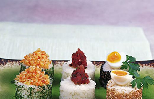 Dreierlei Sushi-Canapés Zutaten 1 kleine Möhre 1 TL Kokosraspel 1 TL Öl Salz und Cayennepfeffer 4 Wachteleier 8 große Petersilienblätter 1 Frühlingszwiebel 50 g frisches Tunfisch- oder Lachsfilet 1 Rezept vorbereiteter Sushi-Reis schwarzer oder heller Sesam zum Wälzen 3 E [...]