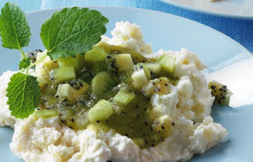 Grießflammeri mit Kiwisauce Zutaten 350 ml Milch (1,5 % Fett) 40 g Weichweizengrieß 100 g Magerquark 2 EL gemahlene Mandeln 1/2 TL abgeriebene Schale von 1 unbehandelten Zitrone 2 EL Ahornsirup 2 große Kiwis 1/2 Päckchen Vanillezucker 2 EL Orangensaft mit Calcium Zitronenme [...]