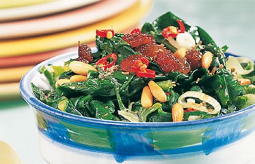 Spinat mit Rosinen und Pinienkernen Zutaten 750 g Spinat Salz 1 Bund Frühlingszwiebeln 4 Knoblauchzehen 1 Stück rote Chilischote 4 EL Olivenöl 40 g Pinienkerne 40 g Rosinen 1/2 TL gemahlener Koriander gemahlener Pfeffer 1 EL Zitronensaft guk:similarity-keywords=""> [...]