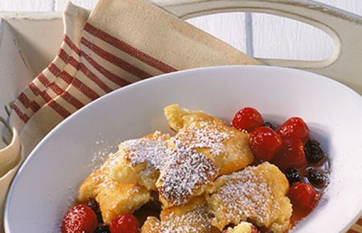 Kaiserschmarrn mit Sauerkirschen Zutaten 250 g Sauerkirschen 1/8 l Weißwein (ersatzweise Kirschsaft) 125 g Zucker 3 EL Rum (nach Belieben) 4 EL Rosinen 6 Eier Salz 1 TL abgeriebene unbehandelte Zitronenschale 5 EL Sahne 80 g Mehl 80 g Butter Puderzucker zum Bestäuben g [...]