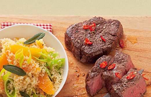 Orangen-Couscous mit Chili-Steaks Zutaten 2 Stangen Lauch 1 Knoblauchzehe 2 EL Olivenöl 100 g Couscous 500 ml Orangensaft Salz schwarzer Pfeffer 4-5 Salbeiblätter 1 Bio-Orange 2 Rinderhüftsteaks (à 150 g) 1 Chilischote guk:similarity-keywords=""> 2 Stangen Lauch , [...]