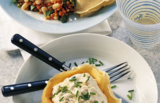 Crêpes mit Sellerie-Apfel-Püree Zutaten 1 1/2 EL Butter 150 g Mehl 350 ml Milch 3 Eier (Größe M) Salz 4 EL Mineralwasser mit Kohlensäure 700 g Knollensellerie 125 g Sahne 3 EL Weißweinessig 125 ml Gemüsebrühe 2 säuerliche Äpfel 1 Bund Schnittlauch 8 EL saure Sahne Fett [...]