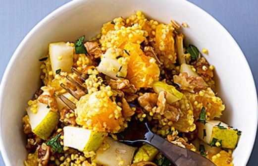 Hirse-Orangen-Salat Zutaten 5 EL Orangensaft 50 g Hirse Salz 3 getrocknete Feigen 1 Orange 1 kleine Birne 2 EL gehackte Walnüsse 1 EL flüssiger Honig 1 EL gehackte Minze 3-4 Spritzer Zitronensaft guk:similarity-keywords=""> 5 EL Orangensaft , 50 g Hirse , [...]