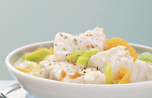 Fischpfanne mit Lauch und Orangenfilets Zutaten 1 kleine Bio-Orange 120 g Parboiled Reis 600 g dünne Stangen Lauch 1 kleiner Zweig Thymian 1 EL Raps- oder Sonnenblumenöl Salz Pfeffer aus der Mühle 100 ml klare Gemüsebrühe 250 g weißes festes Fischfilet 80 ml Sojacreme (zum K [...]