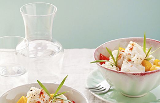 Mango-Seelachs-Salat mit Basmatireis Zutaten 200 ml Gemüsebrühe 75 g Basmatireis 1 Limette Pfeffer aus der Mühle 1 TL scharfer Senf 1 EL Walnussöl 1 TL heller Balsamico-Essig gemahlener Ingwer 300 g Seelachs 1 rote Paprikaschote 1 TL Rapsöl 1 reife Mango Salz Paprikap [...]