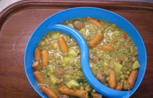 Menge Zutat 2 St mehligkochende Kartoffeln, mittlere Größe 1 Stg Lauch mittlere Größe 1 Dose gekochtes Schweinefleisch 1 Dose Erbsen (groß) 3/4 l Fleischfound [...]
