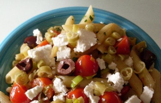 Nudelpfanne *Hellas* Zutaten 250 g Penne Rigate 2-3 EL Olivenöl 1 Stück Lauch und/oder Zwiebel 1-2 Knoblauchzehe/n ca. 150 g Cherry- oder Datteltomaten ca. 15 schwarze Oliven - halbiert und entkernt Salz schwarzer Pfeffer - frisch gemahlen Oregano 100 g Feta einige grüne eing [...]