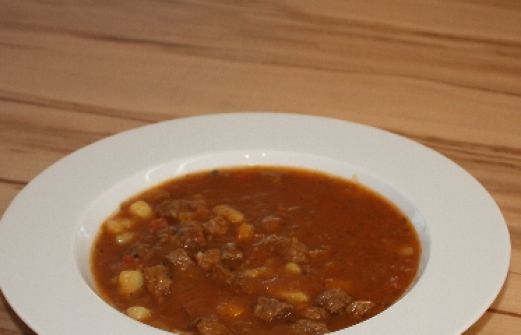 Gulaschsuppe Zutaten 700 g Rindfleisch (Wade oder Schulter) 400 g Zwiebeln 1-2 EL Öl 1 EL Tomatenmark 750 ml Brühe (Gemüse oder Geflügel) 1/2 rote und gelbe Paprikaschote 400 g Kartoffeln Salz, Cayennepfeffer 1 Lorbeerblatt --- --- Gulaschgewürz: 2 Knoblauchzehen 2 Streifen u [...]