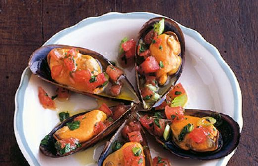 Muscheln mit Tomaten-Vinaigrette Zutaten 1½ kg große Miesmuscheln 3 reife Tomaten 1 Bund Frühlingszwiebeln 2 Stängel Petersilie 4 EL Weißweinessig 6 EL Olivenöl Salz Pfeffer 1 Topf mit Dämpfeinsatz guk:similarity-keywords=""> 1½ kg große Miesmuscheln , 3 reife T [...]