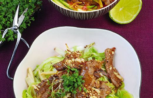 Rindfleisch mit Erdnüssen Zutaten 400 g Rinderlende 1 Dose Bambussprossen (170 g Abtropfgewicht) 300 g Chinakohl 1 Stange Lauch 4 EL ungesalzene Erdnusskerne 4 EL Erdnussöl Salz Pfeffer 1 Knoblauchzehe 6 EL Hühnerbrühe 1-2 EL Fischsauce 1 Beet Kresse guk:similarity-ke [...]