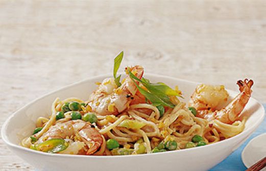 Nudelpfanne mit Garnelen Zutaten 30 g frischer Ingwer 1 Bund Frühlingszwiebeln 400 g rohe TK-Garnelen 2 EL Öl 1-2 EL grüne Currypaste (aus dem Asienladen) 2 EL Fischsauce 400 ml Kokosmilch (aus der Dose) 300 ml Gemüsebrühe 250 g chinesische Weizennudeln 250 g TK-Erbsen 2 EL [...]