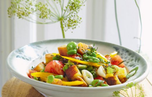 Röstbrotsalat mit dicken Bohnen Zutaten 500 g frische Dicke Bohnen 1 EL frisch gehacktes Bohnenkraut Salz ½ Bund Frühlingszwiebeln 1 gelbe Paprikaschote 3 Tomaten 2 Bund Basilikum 150 g Ciabattabrot 100 ml Öl (z. B. Sonnenblumenöl) 2 Knoblauchzehen 2 TL frisch gehackter Ros [...]