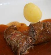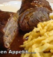 Rinderrouladen Zutaten 6 Cornichons 4 Scheiben Rindfleisch aus der Oberschale (à ca. 160 g, dünn geschnitten) Salz Pfeffer 4 TL scharfer Senf 8 dünne Scheiben Schinkenspeck 1 Zwiebel 2 EL neutrales Pflanzenöl 2 TL Mehl 2 TL Tomatenmark 200 ml trockener Rotwein 500 ml Fleis [...]