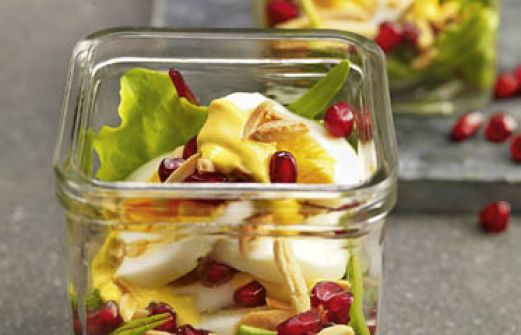 Eiertürmchen mit Granatapfel auf Salat Zutaten 6 Eier 1/2 Bund glatte Petersilie 100 g gemischte verzehrfertige Blattsalate 40 g Mandelstifte 1 Granatapfel je 2 EL Crème fraîche und Mayonnaise 1 EL Zitronensaft etwas abgeriebene Schale einer Bio-Zitrone 1 Döschen Safranpulver [...]