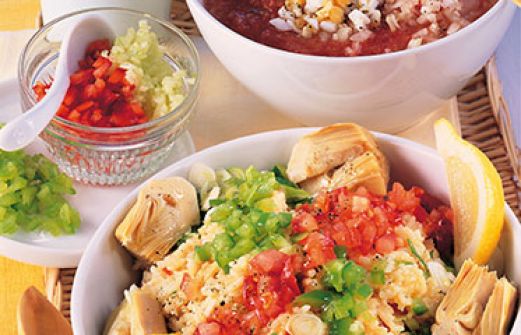 Kalter Jambalaya-Salat Zutaten 2 Zwiebeln 1 Knoblauchzehe 1 EL Butter 140 g Langkorn-Reis 250 ml Gemüsebrühe 3-4 kleine getrocknete rote Chilis 1 Lorbeerblatt 1 TL schwarze Pfefferkörner grobes Meersalz 6 Artischockenherzen (in Öl eingelegt oder aus der Dose) 1 grüne Papri [...]