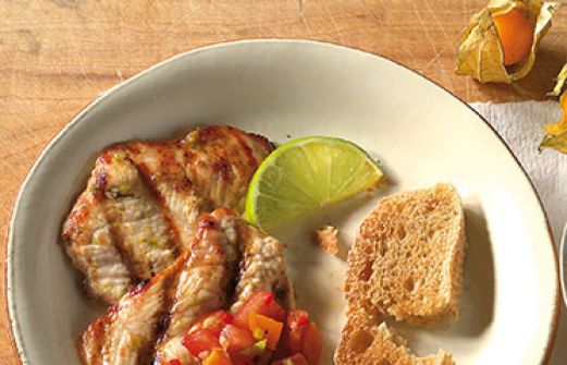Aloe-Limetten-Putensteaks mit Physalis-Salsa Zutaten 8 kleine Putensteaks (à 75 g, ersatzweise 4 Putenschnitzel) 2 Bio-Limetten 75 ml reiner Aloe-Vera-Saft (Bioladen, Reformhaus) 1 frische grüne Chilischoten 500 g schnittfeste Tomaten 100 g Physalis (Kapstachelbeeren) 2 Frühli [...]