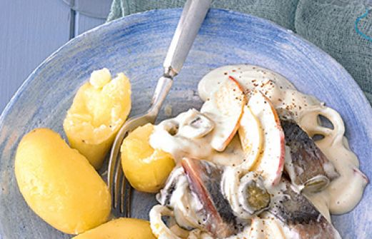 Matjes Hausfrauenart Zutaten 250 g Schmand 150 g Naturjoghurt 150 g Mayonnaise 1-2 TL mittelscharfer Senf 2 rote säuerliche Äpfel 2 kleine Zwiebeln 150 g Cornichons (aus dem Glas) und etwas Gurkensud Salz Pfeffer 1-2 Prisen Zucker 4 Matjes-Doppelfilets guk:similarity-keyw [...]