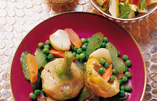 Artischocken mit Gemüse Zutaten 2 Zitronen 1 EL Mehl 4 große runde Artischocken 100 g Schalotten oder kleine Zwiebeln 1 große Möhre 2 Stängel Staudensellerie Salz 1 TL Zucker 6 EL Olivenöl schwarzer Pfeffer, frisch gemahlen 1 Bund Dill 50 g TK-Erbsen guk:similarity- [...]