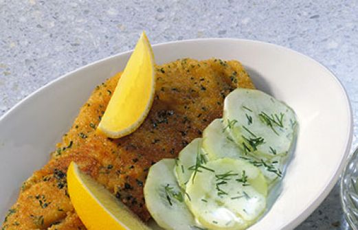 Backfisch mit Gurkensalat Zutaten 4 Rotbarschfilets (je etwa 180 g) Salz Pfeffer 5 EL Zitronensaft 1 Salatgurke 150 g Sahnejoghurt 1/2 TL Zucker 1 EL Öl 1 Bund Dill 1 Bund krause Petersilie 5-6 EL Semmelbrösel 1 Ei 3 EL Mehl 3 EL Butterschmalz guk:similarity-keywor [...]