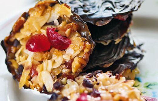 Florentiner Zutaten 50 g kandierte Früchte (z. B. Kirschen, Orangen oder Limetten) 50 g Butter 75 g Zucker 1 Päckchen Vanillezucker 150 g Sahne 50 g Honig 1 EL Mehl 50 g gehackte Mandeln 100 g Mandelblättchen 100 g Zartbitterkuvertüre 1 TL neutrales Öl runde Ausstechform (c [...]