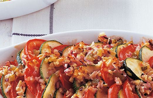 Gratin mit Zucchini und Tomaten Zutaten 400 g Zucchini 400 g Tomaten 2 Knoblauchzehen 1 rote Zwiebel 2 EL entsteinte grüne Oliven 1 TL getrocknete Kräuter der Provence 50 g gehackte Mandeln (ersatzweise Mandelstifte) 50 g Parmesan, frisch gerieben 2 EL Olivenöl Salz Pfef [...]
