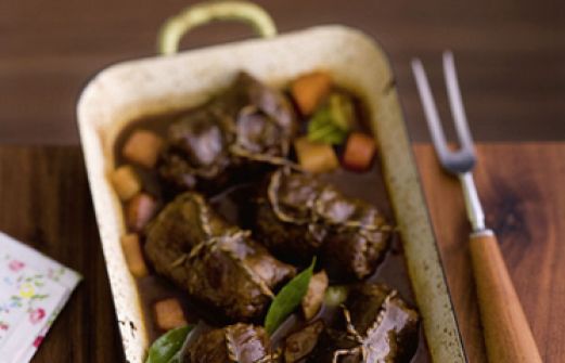 Rinderrouladen Zutaten 4 dünnen Scheiben Rindfleisch für Rouladen (z. B. aus der Keule; à ca. 150 g) 2 Zwiebeln 4 Gewürzgurken Salz Pfeffer 4 TL scharfer Senf 12 Scheiben Frühstücksspeck 2 Möhren 150 g Knollensellerie 1 Stange Lauch 1 EL schwarze Pfefferkörner 2 EL Butt [...]
