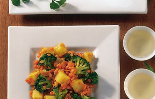 Thai-Gemüse mit roten Linsen Zutaten 1 große Zwiebel 4 große Kartoffeln 4 Möhren 500 g Brokkoli 4 Kaffirlimettenblätter (ersatzweise 1 Stängel Zitronengras) 2 EL neutrales Pflanzenöl 3 TL milde Currypaste (Asienladen; ersatzweise 2 TL Currypulver) 1/4 l Gemüsebrühe (Instant) 3 [...]
