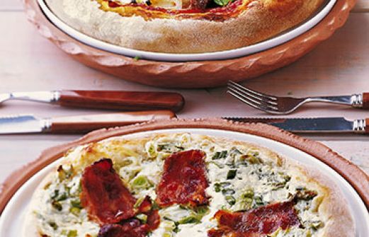 Rahm-Pizza mit Speck Zutaten 1/2 Würfel Hefe (21 g) 2 TL Zucker 250 g Mehl Salz 2 EL Olivenöl 8 Scheiben Bacon (Frühstücksspeck, ca. 120 g) 3 große Bund Frühlingszwiebeln 150 g Crème fraîche 100 g saure Sahne Pfeffer, frisch gemahlen guk:similarity-keywords=""> 1/2 W [...]
