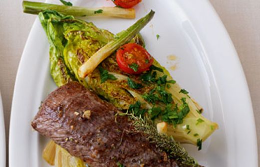 Lammrücken auf gedünsteten Salatherzen Zutaten 200 g ausgelöster Lammrücken 2 EL Olivenöl 1 kleine Knoblauchzehe 6-8 Rosmarinnadeln schwarzer Pfeffer 1 Romanasalatherz 2 Frühlingszwiebeln 4 Kirschtomaten Salz 1 Zweig Thymian 3 Stängel glatte Petersilie einige Spritzer Z [...]