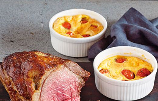 Roastbeef mit Tomaten-Clafoutis Zutaten 1 1/2 EL Butter 1 EL Mehl 1 Knoblauchzehe 2 Zweige Rosmarin 250 ml Rinderfond (aus dem Glas) 150 ml Rotwein (oder zusätzlicher Fond) 250 g Kirschtomaten 3-4 Zweige Thymian 2 EL Olivenöl Salz 1/2 TL Zucker 1 kg Roastbeef (mit dünner [...]