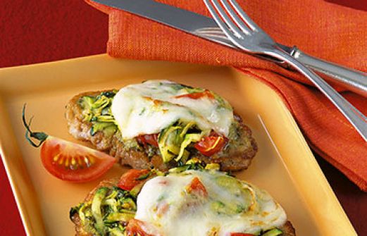 Italia-Schnitzel Zutaten 4 Schweineschnitzel (je ca. 120 g) 4 EL Pesto (Glas) 4 kleine Zucchini 1/2 Bund Basilikum 1 Dose stückige Tomaten (800 g) 50 g Sahne Salz Pfeffer 150 g Mozzarella Öl für die Form guk:similarity-keywords=""> 4 Schweineschnitzel (je ca. 120 g) [...]