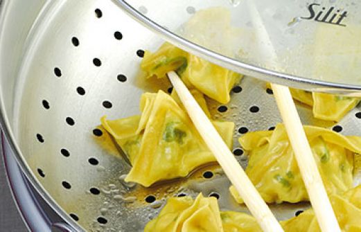 Gedämpfte Lachs-Wan-Tans Zutaten 30 tiefgekühlte Wan-Tan-Blätter (10 × 10 cm) 200 g Blattspinat 2 Frühlingszwiebeln 2 Schalotten 1 Knoblauchzehe 250 g Lachsfilet ohne Haut Salz Pfeffer 2 EL Zitronensaft 2 TL Sesamöl 2 EL helle Sojasauce Dämpfeinsatz Öl zum Einfetten Ch [...]