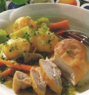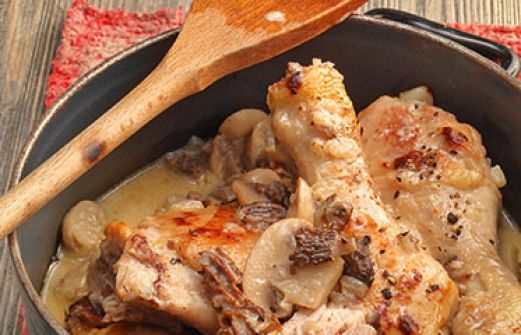 Hähnchen mit schwarz-weißer Sauce Zutaten 4 große Hähnchenkeulen (je ca. 250 g) Salz Pfeffer 10 g getrocknete Spitzmorcheln 250 g kleine weiße Champignons 1 EL Zitronensaft 1 Zwiebel 3 EL Butter 300 ml Hühnerbrühe (Instant) 100 ml Weißwein (ersatzweise heller Traubensaft) [...]