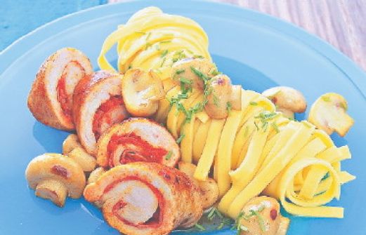 Hähnchen-Rouladen in Weißwein Zutaten 250 g Champignons 4 Hähnchenbrustfilets (600 g) Salz Pfeffer 4 TL Pesto rosso (Glas) 4 Scheiben Parmaschinken (40 g) 2 EL Olivenöl 1/4 l Weißwein 1/8 l Geflügelbrühe guk:similarity-keywords=""> 250 g Champignons , 4 Hähnchenb [...]