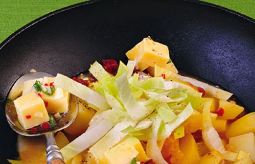 Weißwein-Kartoffeln mit mariniertem Ziegenkäse Zutaten 500 g festkochende Kartoffeln 1 Zwiebel 10 g Butter 200 ml heiße Gemüsebrühe (Instant) 40 g getrocknete Tomaten 4 Blätter Endiviensalat (ersatzweise Chicorée) 100 ml trockener Weißwein (z. B. Grauburgunder, Riesling oder Ch [...]