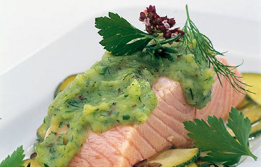 Lachs mit Zucchini-Duo Zutaten 1 Bund gemischte Kräuter 700 g schlanke feste Zucchini 2 Schalotten 3 EL Butter 250 ml Gemüsebrühe 2 TL frisch gepresster Zitronensaft Salz Pfeffer 6 Zweige Thymian 2 Wacholderbeeren Öl zum Einfetten 4 Lachsfilets (à 150 g) guk:similar [...]
