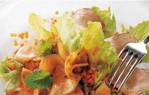 Linsen-Gurken-Salat mit Curry-Dressing Zutaten 400 g Schweinefilet Pfeffer 2 Esslöffel Öl 100 g rote Linsen Salz 1 Bund Lauchzwiebeln 250 g Salatgurke 1 Kopf Eisbergsalat (200 g) 1 Becher Schmand (200 g) 4 Esslöffel Gemüsebrühe 3 Esslöffel Sherryessig Salz grober Pfeffer [...]